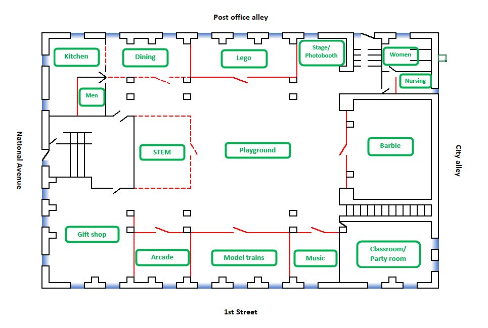 The main question we’ve been asked is “what are you going to do with it?” Well, here it is. The top floor is an apartment already which is where we are living. The family business will be on the main floor. You can see the main floor as it currently is and our current vision for what it will be one day. We plan on creating a museum with interactive components. For each of the sections we’ll have some displays behind plexiglass and others that visitors can explore hands on. We will also be teaching classes ourselves (or leasing space for others to do so), hosting clubs and birthday parties. Be sure to follow our blog to keep tabs on our progress converting this open space into a realization of dreams.